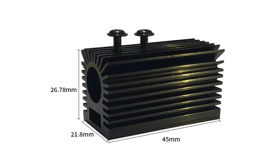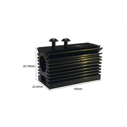 Hliníkový žebrovaný chladič určený pro laserové moduly o průměru 12 mm. Díky hustému žebrování poskytuje výrazně zvýšenou plochu pro odvod tepla, což zajišťuje stabilní provoz i u výkonnějších laserů a dlouhodobého zatížení. Součástí jsou dva svěrné šrouby pro pevné uchycení modulu a více montážních otvorů pro různá uchycení. Ideální pro průmyslové aplikace, DIY projekty, CNC stroje i optické systémy.